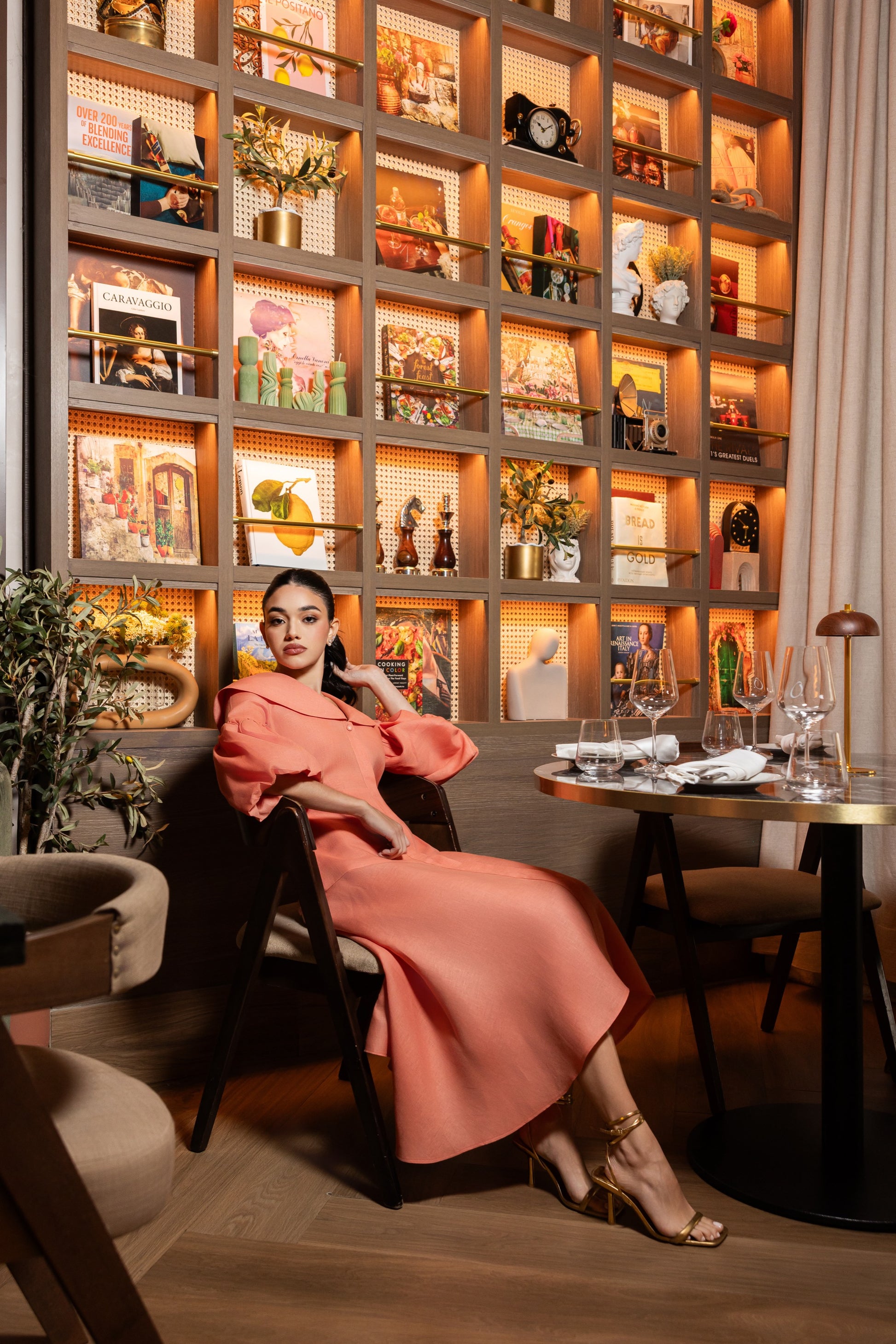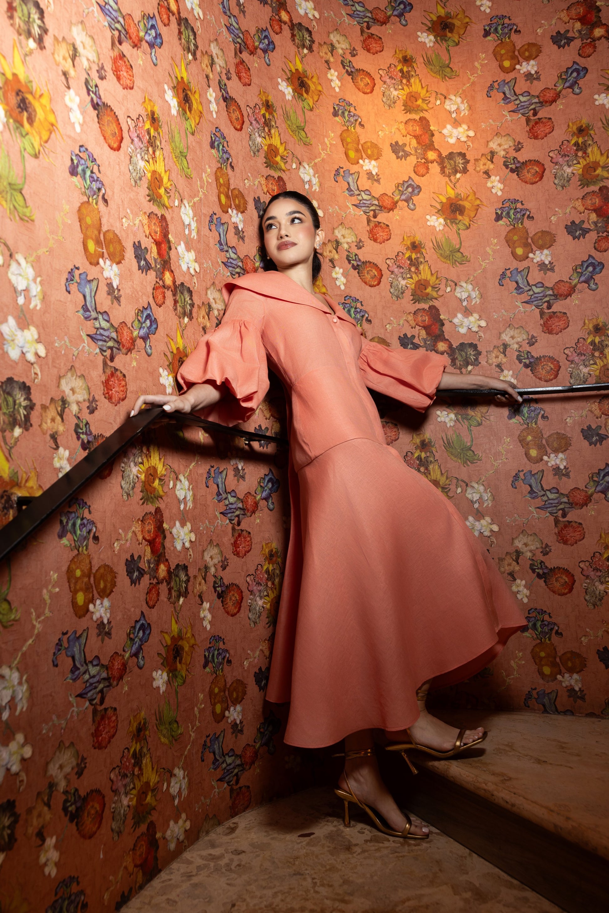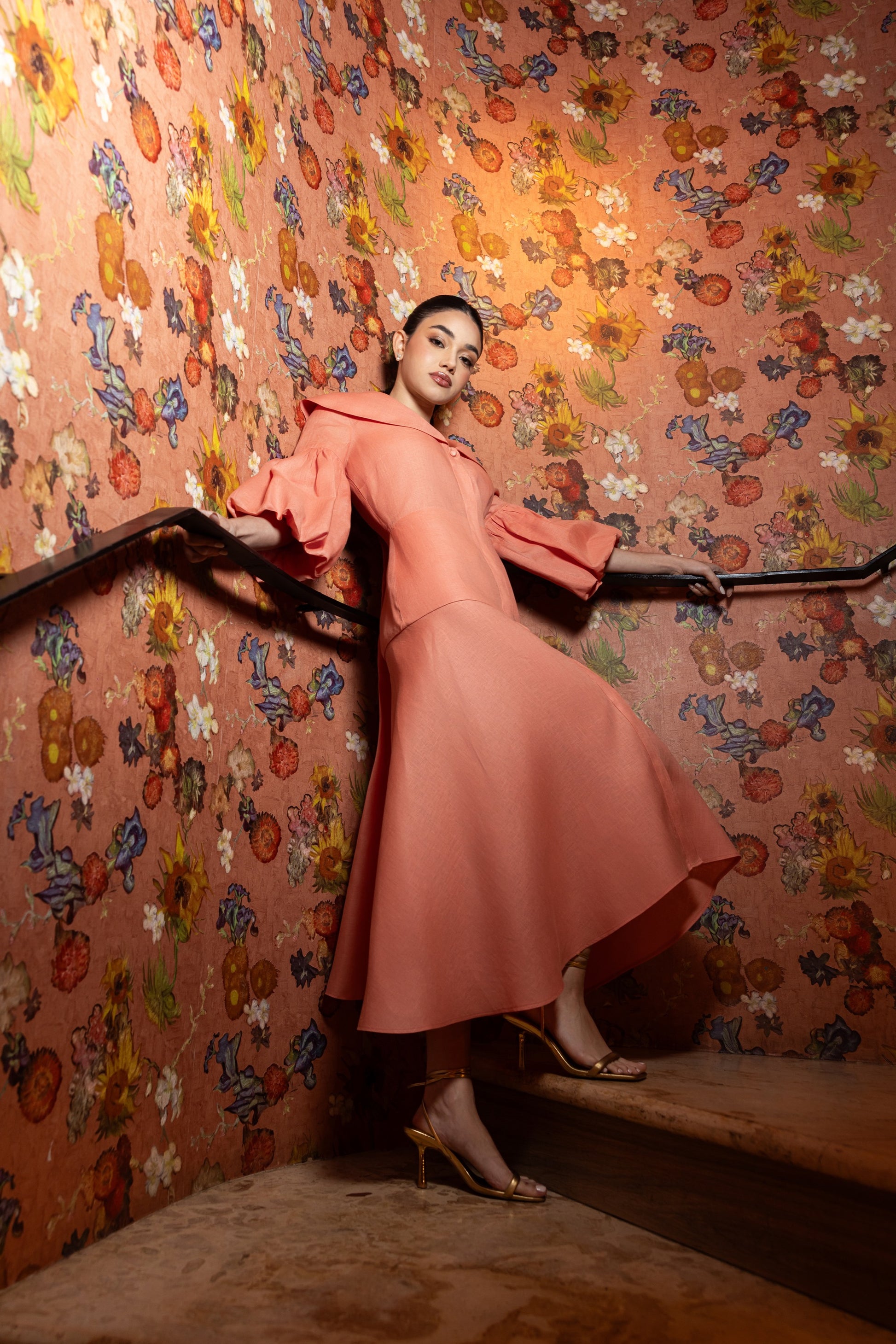 Soft sophistication redefined a peach linen midi dress featuring gently exaggerated sleeves and an oversized collar that adds architectural interest. Effortlessly chic, its clean lines and warm tone create a look that’s both delicate and striking.