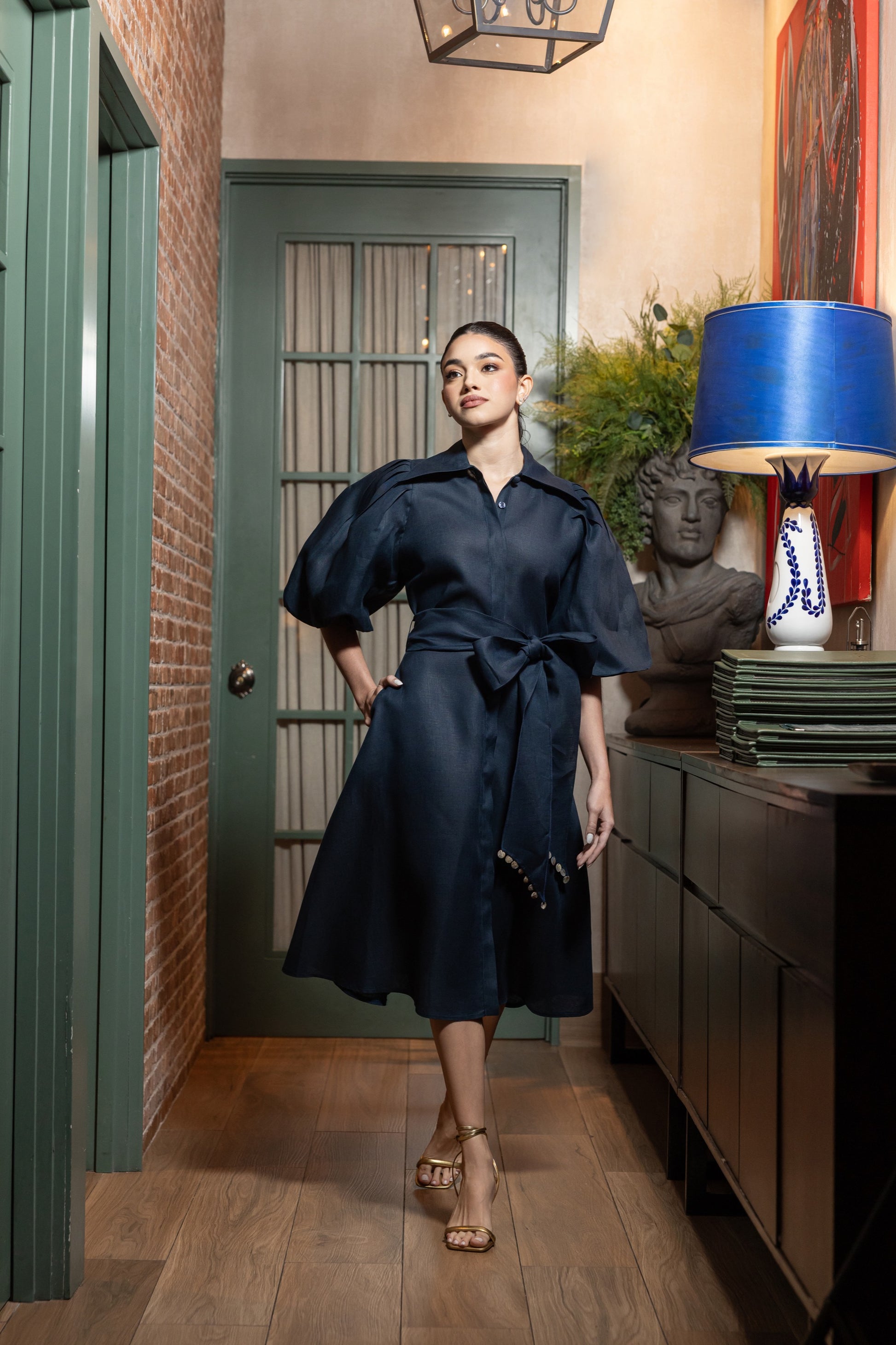 Timeless polish with a contemporary twist  a navy linen shirt-dress elevated with dramatic puff sleeves and a cinched waist bow. The midi length and clean tailoring make it a versatile piece that flows between daytime class and evening elegance.